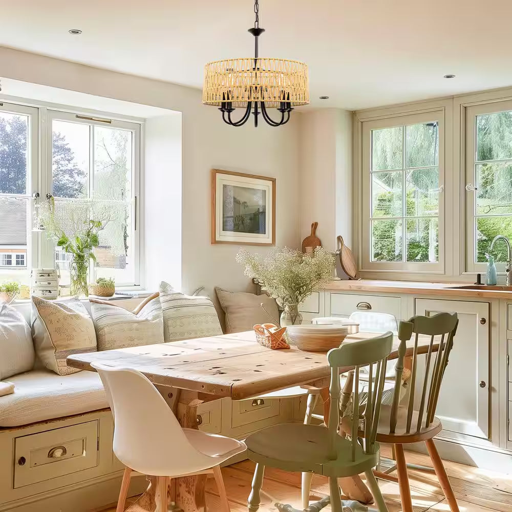 • Woven rattan shade adds rustic charm to your dining room