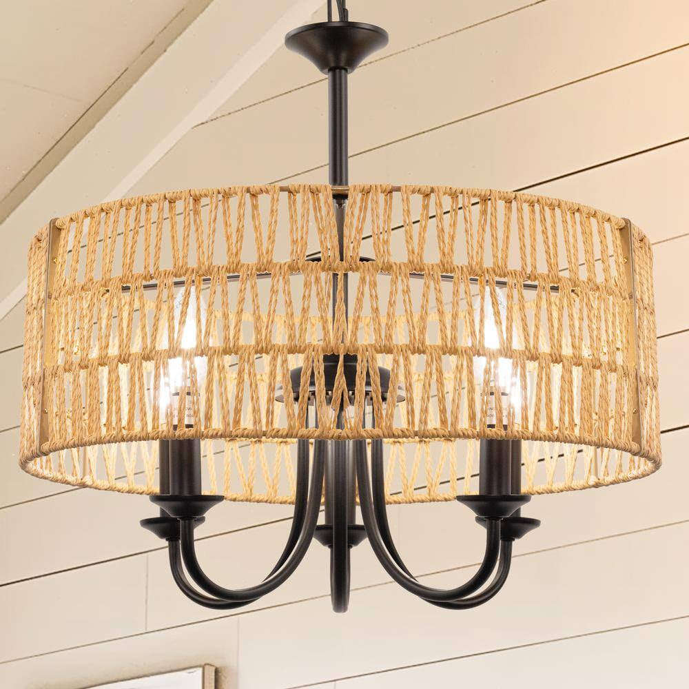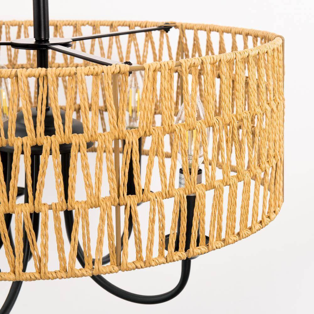 5-Light Modern Farmhouse Brown round Rattan Pendant Rattan Drum Chandelier with Woven Rattan Shade for Dining Room