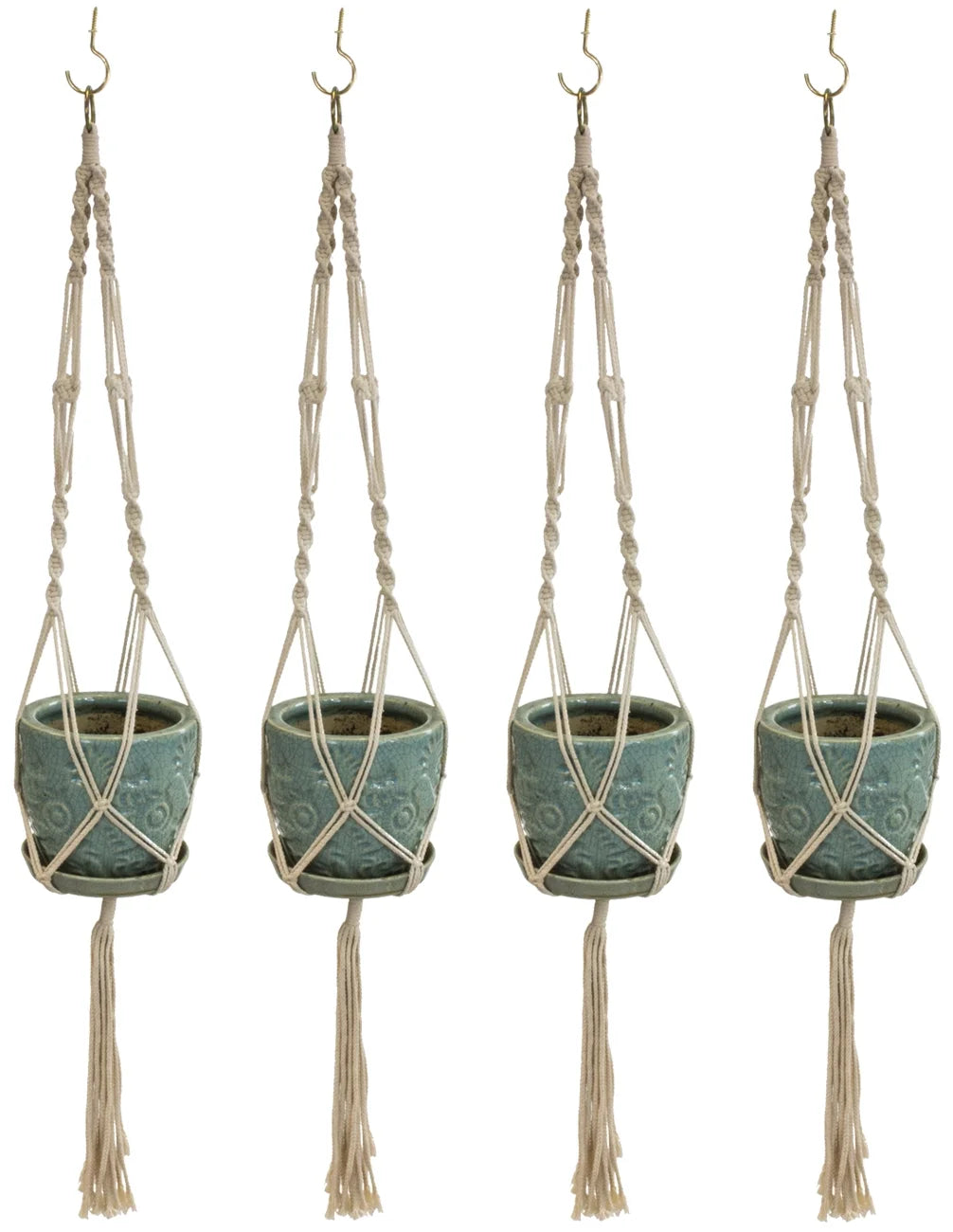 Macramé plant hangers bring good vibes and a bohemian style to any space! This set of four features an intricate rope twist design with tassels and hanging hooks. Use it to suspend a variety of pot shapes and sizes, whether round or square. Then, add your favorite spider plants, faux flowers, succulents, and more. Once installed from your ceiling or wall, these hangers keep plants off the ground and away from pets and children. Charming vintage appeal adds character, while your plants purify the air bringing positivity to your home, garden, or patio.