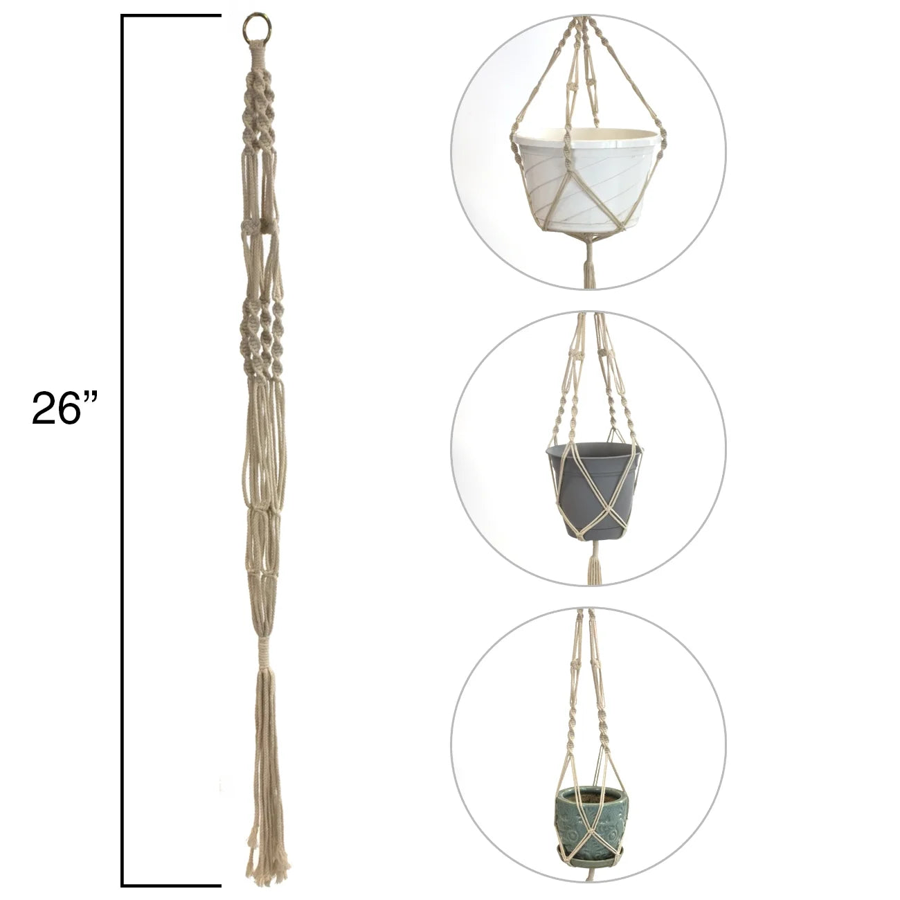 - STYLISH & DURABLE DESIGN — Modern bohemian luxe style with vintage-inspired aesthetic — Features intricate woven macramé rope twist design with tassels— Elegant off-white neutral color — Complements most décor — Makes a great gift — Made of cotton — Strong and durable — Plants and flower pots NOT INCLUDED — Measures approximately 41” L (from hook to tassel)